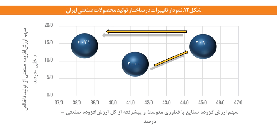 تأثیر مستقیم این کمبود سرمایهگذاری در ساختار صنعتی کشور کاملاً قابل مشاهده است. در فاصلهی سالهای ۲۰۱۰ تا ۲۰۲۲، سهم صنایع با فناوری متوسط و بالا از کل تولید صنعتی از ۴۵ درصد به ۳۸ درصد کاهش یافته است. این کاهش، نشانهای نگرانکننده از گرایش تدریجی صنعت ایران به سمت تولیدات سنتیتر و با ارزش افزودهی پایینتر است. به همین ترتیب، سهم صنعت از تولید ناخالص داخلی نیز تقریباً در سطح ۱۴ درصد باقی مانده و طی دو دههی گذشته هیچ رشدی نشان نداده است؛ وضعیتی که حکایت از رکود مزمن در توان تولید صنعتی کشور دارد.