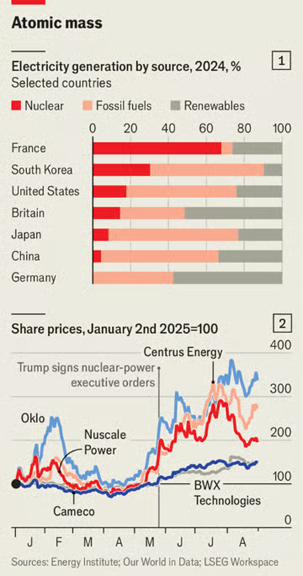 تغییر نگرش نسبت به انرژی هستهای بهوضوح در ایالات متحده و اروپا مشاهده میشود. در آمریکا، تلاشهایی در جریان است تا ظرفیت داخلی هستهای تا سال ۲۰۵۰ به ۴۰۰ گیگاوات (GW) برسد (اگرچه این هدف بلندپروازانه تلقی میشود) و سیاستگذاران با تصمیمی مانند قانون یک لایحه بزرگ زیبا (One Big Beautiful Bill Act)، اعتبار مالیاتی سخاوتمندانهای را به این صنعت اختصاص دادهاند. ایالتهای مختلف آمریکا، از جمله تگزاس جمهوریخواه و برخی ایالتهای دموکرات مانند نیویورک، اکنون از ساخت تأسیسات جدید حمایت میکنند. بهعنوان مثال، شرکت فِرمی آمریکا (Fermi America) که توسط ریک پری، وزیر سابق انرژی ایالات متحده، راهاندازی شده است، در حال ساخت بزرگترین مجموعه انرژی و دیتاسنتر (مرکز داده) است که شامل رآکتورهای هستهای مرسوم و چندین رآکتور مدولار کوچک (SMRs) خواهد بود و هدف تولید ۱۱ گیگاوات برق را دنبال میکند.