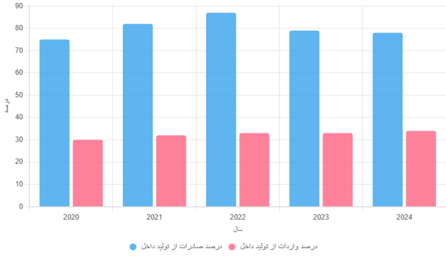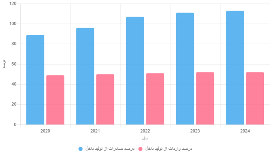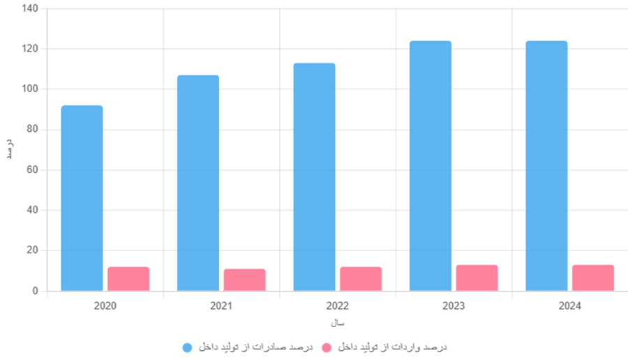 در زمینهی صادرات، چین با جهشی چشمگیر از ۱٬۲۰۰ میلیارد دلار در ۲۰۲۰ به ۲٬۱۰۰ میلیارد دلار در ۲۰۲۴، سهم صادرات از تولید داخلی خود را از ۹۲ درصد به ۱۲۴ درصد افزایش داده است. این عدد بیش از ۱۰۰ درصدی نشاندهندهی وابستگی صادرات به ورودیهای وارداتی است، اما همچنان بیانگر تسلط چین بر بازارهای جهانی است.