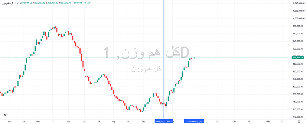در سطح شاخص کل و شاخص هم‌وزن، رفتار متفاوتی قابل مشاهده بود: شاخص کل در هفته سوم مهر رشد حدود ۱٫۶ درصدی را ثبت کرد و تا محدوده‌ای نزدیک به دو میلیون و ۹۷۲ هزار واحد بالا آمد، در حالی که شاخص هم‌وزن رشدی پرشتاب‌تر (حدود چهار درصد) داشت که بازتاب افزایش تقاضا در سهم‌های کوچک بود. این الگوی اختلافی نشان می‌دهد نوسان‌گیران و سرمایه‌گذاران کوتاه‌مدت بیشتر در سهم‌های کوچک فعال شده‌اند و جریان نقدینگی به‌صورت مقطعی از نمادهای بزرگ فاصله گرفته است.