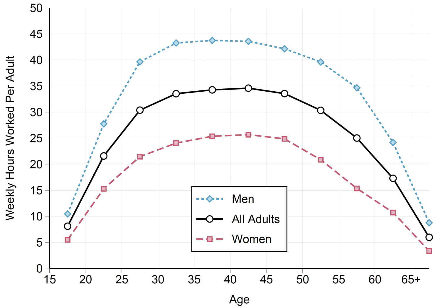 در مقابل، ساعات کار بزرگسالان در سنین اوج کار (۲۰ تا ۵۹ سال) در طول مسیر توسعه، به طور قابل توجهی پایدار باقی مانده است. این پایداری تاریخی، مثلاً در ایالات متحده که ساعات کار در سال ۱۹۰۰ و امروز تقریباً یکسان (حدود ۳۰ ساعت در هفته) است، چشمگیر است. این ثبات، همگرایی قابل توجهی در ساعات کار بین دو جنس را پنهان میکند. در بسیاری از مناطق، کاهش ساعات کار مردان (که عمدتاً ناشی از کاهش ساعات کار به ازای هر شاغل بوده) دقیقاً با افزایش مشارکت نیروی کار زنان (ناشی از افزایش نرخ اشتغال) جبران شده است. این همگرایی نشان میدهد که فرایند توسعه تمایل دارد ساعات کار را در بین جنسیتها متعادل سازد.