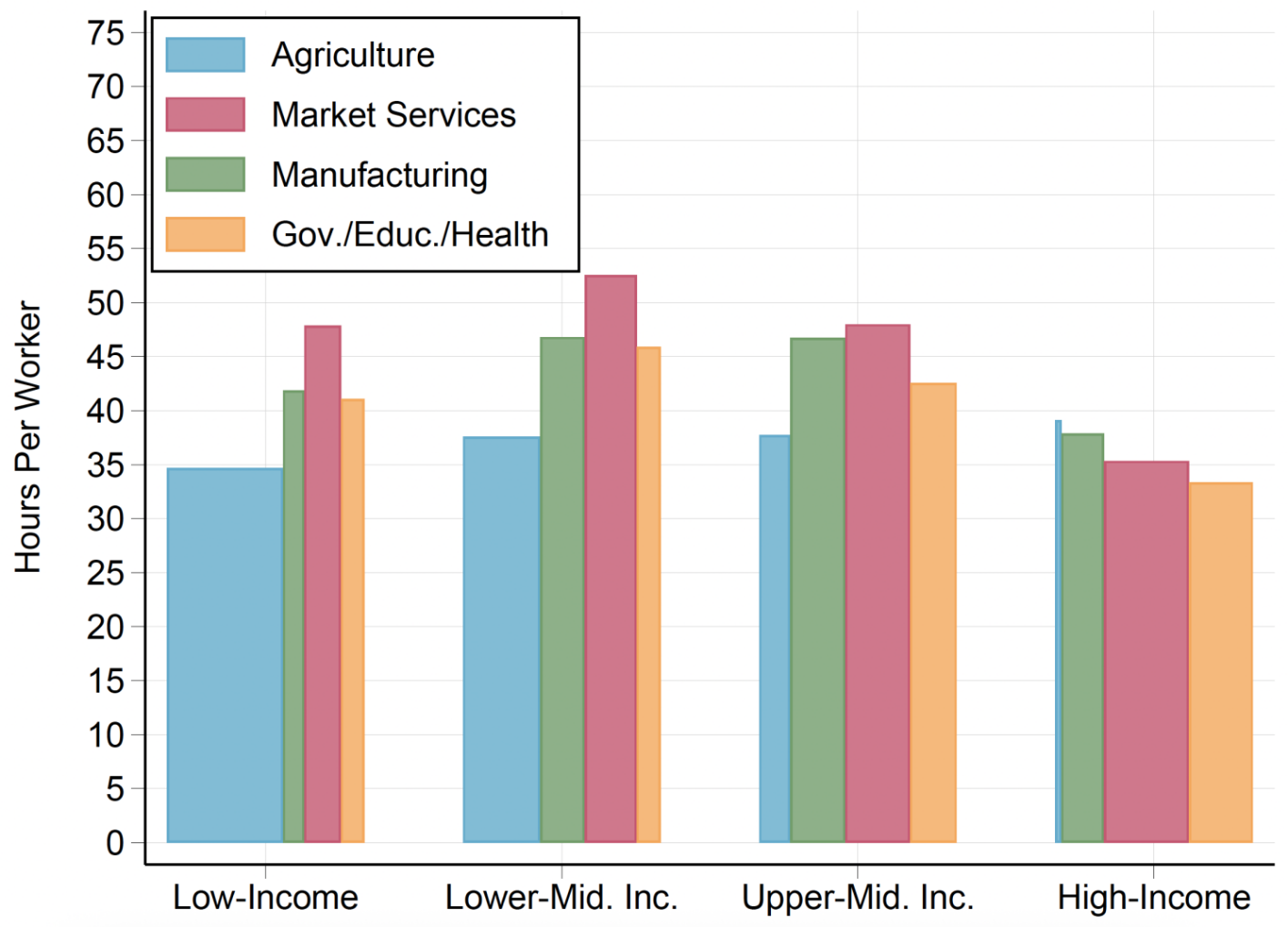 در سطح کلان، ساعات کار هفتگی به ازای هر بزرگسال، با افزایش سرانه تولید ناخالص داخلی (GDP) یک شکل زنگولهای ملایم نشان میدهد؛ به طوری که ساعات کار در کشورهای با درآمد پایین و بالا کمترین و در کشورهای با درآمد متوسط بیشترین مقدار را دارند. با این حال، رابطه کلی میان توسعه اقتصادی و ساعات کار ضعیف است و توسعه تنها بخش کوچکی از تفاوتهای میان کشورها را توضیح میدهد. الگوی زنگولهای ساعات کار با توسعه، کاملاً توسط ساعات کار به ازای هر شاغل (حاشیه فشرده یا intensive margin) هدایت میشود، زیرا نرخ اشتغال در طول توسعه نسبتاً ثابت میماند. این پدیده به تغییرات ساختاری مرتبط است، زیرا ساعات کار در بخشهای تولید و خدمات در کشورهای با درآمد متوسط بسیار بالا است.