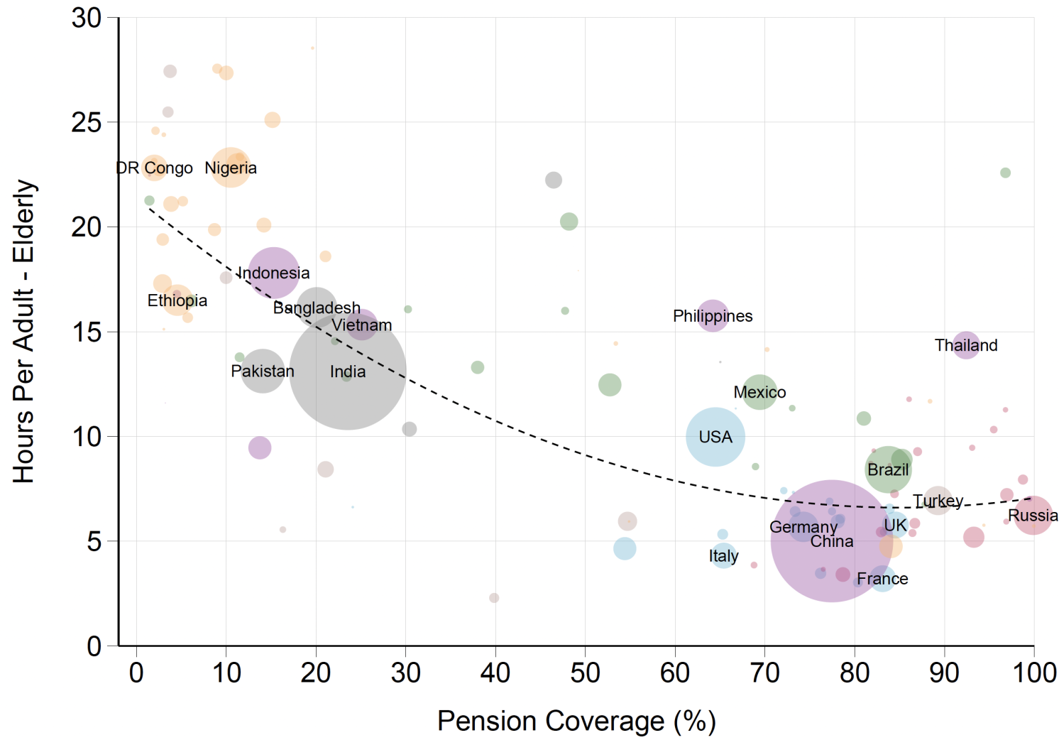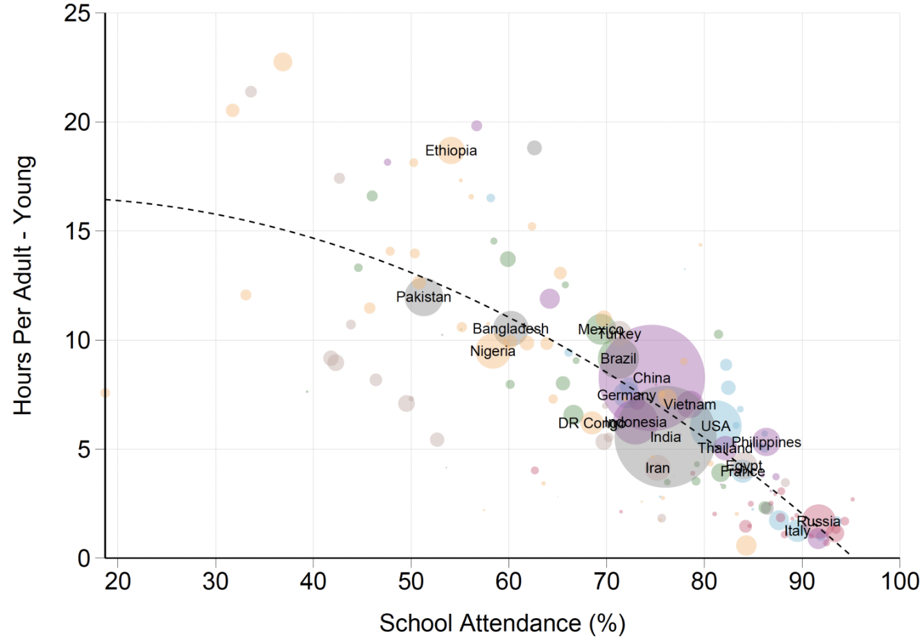 ساعات کار گروههای جوان و سالمند با توسعه اقتصادی رابطه معکوس و قوی نشان میدهند. کاهش ساعات کار این گروهها به طور کامل توسط عوامل نهادی توضیح داده میشود: توسعه نظامهای آموزش عمومی (برای جوانان ۱۵ تا ۱۹ سال) و نظامهای بازنشستگی دولتی (برای افراد ۶۰ سال به بالا). به عبارت دیگر، درآمد بالاتر به خودی خود عامل کاهش ساعات کار این گروهها نیست، بلکه توسعه نهادهای مرتبط با آن است.