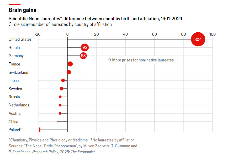 ایالات متحده به عنوان بزرگترین بهرهبردار از این جریان استعدادهای جهانی شناخته میشود. کشفیاتی که در خاک این کشور انجام شدهاند، مجموعاً ۳۰۴ جایزه علمی نوبل را به همراه داشتهاند که بسیار بیشتر از هر کشور دیگری است. با این حال، این تسلط شدیداً متکی به مهاجرت است؛ تنها حدود ۷۰ درصد از این جوایز به دانشمندانی تعلقگرفته که متولد آمریکا بودهاند. این آمار نشاندهنده اهمیت حیاتی جذب دانشمندان خارجی برای حفظ برتری علمی آمریکا است.