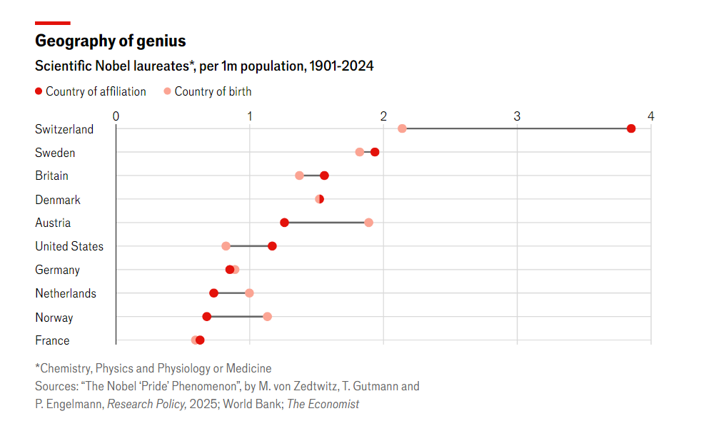 تمرکز قدرت علمی نیز قابل توجه است. بیش از چهار پنجم کشفیات برنده جایزه توسط پنج قدرت علمی اصلی یعنی آمریکا، بریتانیا، فرانسه، آلمان و سوئیس انجام شده است. این امر نشان میدهد که علیرغم جهانیشدن، نوآوریهای پیشرو همچنان در مناطق محدودی متمرکز هستند. به عنوان مثال، چین با وجود نیروی کار علمی بسیار گسترده، تنها یک جایزه نوبل برای تحقیقات انجامشده در سرزمین اصلی کسب کرده است، هرچند شش برنده متولد چین برای تحقیقات در آمریکا و یک نفر برای تحقیقات در بریتانیا جایزه گرفتهاند.