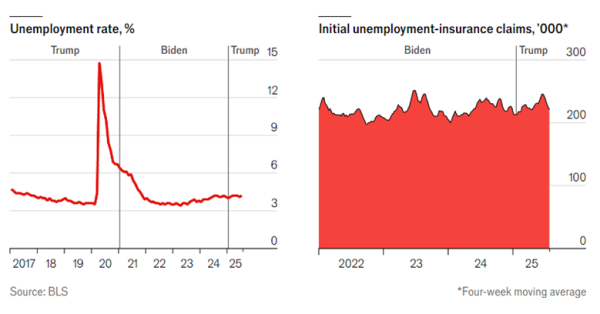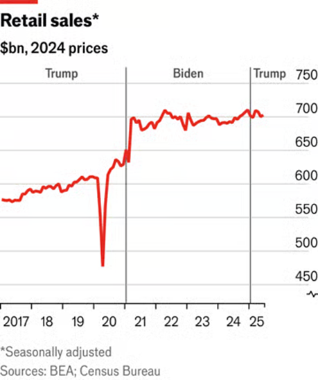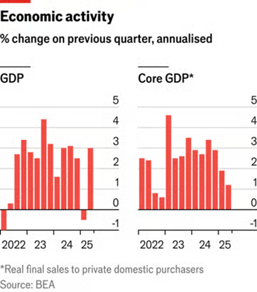 تولید ناخالص داخلی: آمار مربوط به دو فصل نخست سال ۲۰۲۵ از کاهش رشد اقتصادی حکایت دارد. در فصل اول، تولید ناخالص داخلی با انقباض مواجه شد؛ مسئله‌ای که با پدیده‌ای به نام «پیش‌دستی تعرفه‌ای» پیچیده‌تر شد. در این وضعیت، شرکت‌ها تلاش کردند تا پیش از اجرای تعرفه‌های جدید، کالاهای خود را وارد کشور کنند. این موضوع باعث کاهش صادرات خالص شد، اما بخشی از آن با افزایش موجودی انبارها جبران گردید (که احتمالاً ناشی از خطای اندازه‌گیری بود). این اثر در فصل دوم خنثی شد و رشد به طور موقت افزایش یافت. برای درک بهترِ این نوسانات، شاخص «فروش نهایی واقعی به خریداران خصوصی داخلی» (گاه به آن هستة واقعی تولید ناخالص داخلی گفته می‌شود و مؤلفه‌های تجاری را حذف می‌کند) نشان می‌دهد که اگرچه رشد همچنان مثبت است، اما در سال ۲۰۲۵ به طور چشمگیری کاهش یافته است. این روند با داده‌های ضعیف و تعدیل‌شده اشتغال نیز تأیید می‌شود.