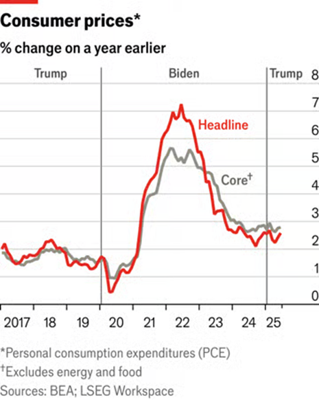 تورم: نشانه‌هایی از شتاب‌گیری تورم مشاهده می‌شود. شاخص قیمت هزینه‌های مصرف شخصی (PCE) که معیار ترجیحی فدرال رزرو برای سنجش تورم است، در ماه ژوئن به ۲.۶ درصد رسید؛ رقمی که بالاتر از هدف ۲ درصدی این نهاد است. اگرچه کاخ سفید کنترل مستقیمی بر قیمت‌ها ندارد، اما تعرفه‌های ترامپ به‌تدریج در قیمت کالاها بازتاب یافته‌اند. در نتیجه، انتظار می‌رود فدرال رزرو کاهش چشمگیر نرخ بهره را به تعویق بیندازد تا ابتدا آثار تورمی ناشی از تعرفه‌ها روشن‌تر شود. انتظارات تورمی بلندمدت نیز در حال حاضر در بالاترین سطح خود طی دهه‌های اخیر قرار دارد.