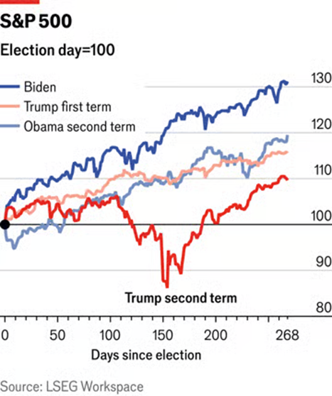 بازارهای سهام: علی‌رغم فضای کلی منفی اقتصاد، بازارهای سهام توانسته‌اند از نوسانات آغاز سال به طور چشمگیری بازیابی شوند و شاخص S&P 500 به سطوح تاریخی خود بازگردد. با این حال، رشد این شاخص در دوره دوم ریاست‌جمهوری ترامپ کمتر از آغاز دوره‌های ریاست‌جمهوری اخیر (از جمله دوره اول خود او) بوده است. موج جدید تعرفه‌ها که در اواخر ژوئیه و اوایل اوت اعلام شد، بر احساسات بازار تأثیر منفی گذاشت؛ به‌طوری که شاخص S&P 500 در آن هفته ۲.۵ درصد افت کرد و بازارهای جهانی سهام نیز روند نزولی در پیش گرفتند.