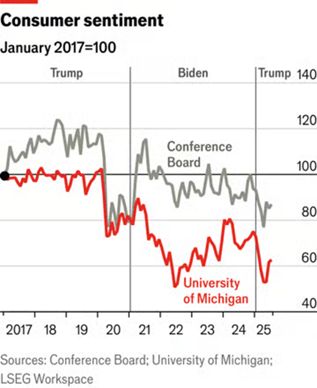 احساس عمومی مصرف‌کنندگان: نظرسنجی‌ها نشان می‌دهند که حس بدبینی در میان مردم عادی آمریکا غالب شده است. شاخص احساس مصرف‌کننده دانشگاه میشیگان پس از اعلام تعرفه‌های ماه آوریل به پایین‌ترین سطح خود از اواسط سال ۲۰۲۲ رسید و تنها اندکی بهبود یافته است. از منظر تاریخی، چنین سطوح پایینی اغلب نشانه‌ای از رکود بوده‌اند. نگرانی نسبت به تورم به طور خاص در میان مردم برجسته است. شاخص احساس مصرف‌کننده «هیئت کنفرانس» (The Conference Board) نیز قبل از بهبود خفیف، به پایین‌ترین سطح خود از اکتبر ۲۰۱۱ سقوط کرد. البته پاسخ‌های این نظرسنجی‌ها به‌شدت تحت‌تأثیر گرایش‌های حزبی پاسخ‌دهندگان قرار دارد.