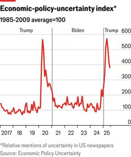 نااطمینانی در سیاست اقتصادی: شاخص نااطمینانی سیاست اقتصادی که پوشش رسانه‌ای، سیاست‌های مالیاتی و اختلاف‌نظر بین تحلیل‌گران را رصد می‌کند، بار دیگر به‌شدت افزایش یافته، هرچند نسبت به اوج خود در آوریل اندکی کاهش یافته است. نااطمینانی بالا به‌خودی‌خود می‌تواند مشکل‌ساز باشد؛ چرا که تصمیم‌گیری برای خریدهای بزرگ یا سرمایه‌گذاری در شرایطی که چشم‌انداز آینده اقتصاد مبهم است، بسیار دشوار می‌شود.