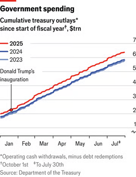 هزینه‌ها و بدهی فدرال: ترامپ وعده داده است که هزینه‌های دولت فدرال را کاهش دهد. او برنامه‌ای به نام «DOGE» راه‌اندازی کرده که هدف آن، کاهش سالانه تا سقف ۲ تریلیون دلار از بودجه دولت است. اما این هدف «غیرواقع‌بینانه» تلقی می‌شود؛ زیرا چنین کاهش‌هایی از کل مخارج اختیاری دولت نیز فراتر می‌رود. در عمل، اگر به جریان نقدی خزانه‌داری نگاه کنیم، هزینه‌های دولت فعلاً از سال‌های قبل بیشتر بوده و این نشان می‌دهد که دولت فعلاً در اجرای برنامه کاهش هزینه‌ها عقب‌مانده است. در نتیجه، مسیر مالی آمریکا همچنان ناپایدار باقی مانده است.