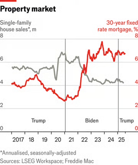 بازار مسکن و نرخ بهره: بازار مسکن یکی از عوامل تعیین‌کننده چرخه‌های تجاری است که بیش از سیاست‌های ریاست‌جمهوری به نرخ‌های بهره واکنش نشان می‌دهد. در حال حاضر، نرخ‌های بهره بالا یکی از موانع اصلی رشد محسوب می‌شوند. در ماه آوریل، متوسط نرخ بهره وام ۳۰ساله ثابت برابر با ۶.۸۱ درصد بود؛ نرخی که بسیار بالاتر از نرخ‌های پایین متداول در دهه پیش از همه‌گیری کروناست. فروش مسکن از اوج‌های زمان کرونا به طور پیوسته کاهش یافته و با توجه به تداوم نرخ‌های بالای وام، انتظار نمی‌رود به‌زودی بهبود یابد. این امر به‌احتمال زیاد موجب کاهش فعالیت‌های ساخت‌وساز خواهد شد.