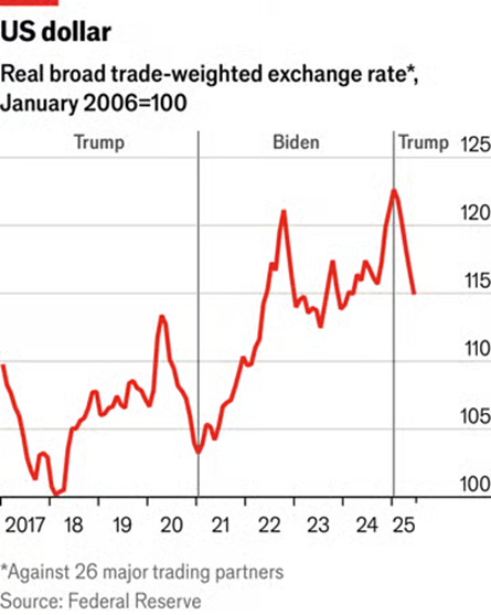 دلار آمریکا: ترامپ و معاونش جی دی ونس هر دو از تضعیف دلار حمایت کرده‌اند و استدلال می‌کنند که قدرت دلار به صنعت آمریکا لطمه می‌زند؛ زیرا رقابت‌پذیری محصولات آمریکایی را کاهش می‌دهد. به‌صورت محدود، دلار از زمان آغاز دوره دوم ترامپ در برابر اکثر ارزهای اصلی تضعیف شده است. با این حال، این تضعیف عمدتاً ناشی از سیاست‌های خود او به‌ویژه رویکردهای تجاری فوق‌العاده تهاجمی بوده است. خطر آنجاست که اگر سرمایه‌گذاران نسبت به ثبات آمریکا تردید کنند، تمایل خود را به خرید دارایی‌های آمریکایی و در نتیجه دلار کاهش دهند. دلار ضعیف‌تر همچنین می‌تواند به افزایش تورم دامن بزند؛ زیرا واردات کالا را گران‌تر می‌کند.
